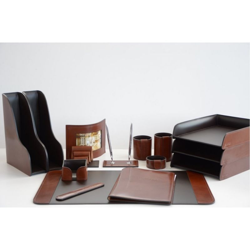 Классический письменный набор состоит из таких необходимых предметов как лоток для бумаг, часы, держатель для визиток, подставка для карандашей и прочее.