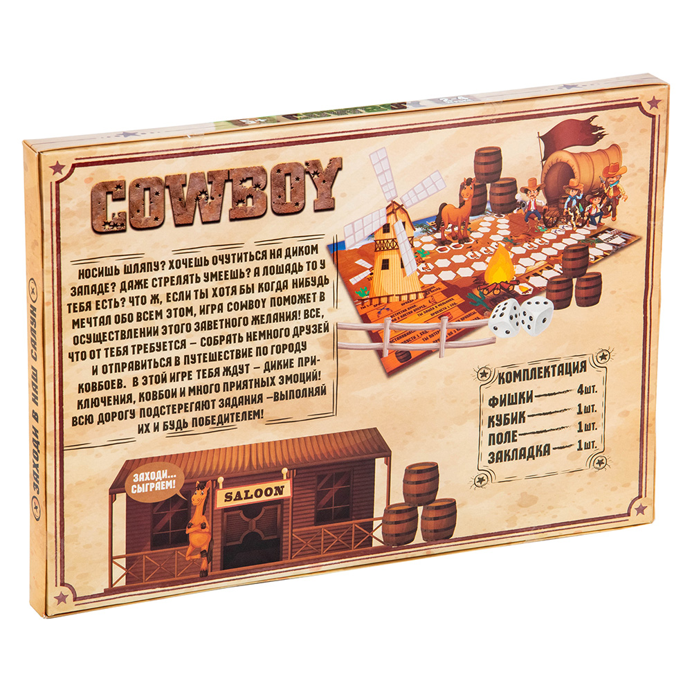 Приключения на Диком западе, ковбои, мустанги и грохот кольтов ждут малыша в настольной игре «Cowboy» (Strateg 30314). Игра для компании до 4 человек — сможет заинтересовать не только детей, но и взрослых, даст возможность увлекательно провести время всей семье, при этом развить внимательность, проявить свои знания и развлечься. В соответствии с очками, выпавшими на кубике, игроки передвигают фишку на игровом поле, на котором есть много заданий и подсказок, делающих игру еще интересней. Игровое поле украшено красочными рисунками с изображениями пейзажей прерий и атрибутов Дикого запада. В процессе игры необходимо выполнить задания и преодолеть препятствия. Выполнивший задание может передвинуть свою фишку. Побеждает тот, кто первым придет к финишу – посетит знаменитый салун! Правила просты, но игра увлечет участников с первой партии. Дополнительный бонус – в комплекте есть закладка, выполненная в стилистике игры. Размер игрового поля 21 х 29 см. Язык русский. Возраст: 5+ Количество участников: от 2 до 4; Материал: картон; Комплект: игровое поле, 4 фишки, кубик, закладка, инструкция; Размер упаковки: 37 х 25 х 2 см.