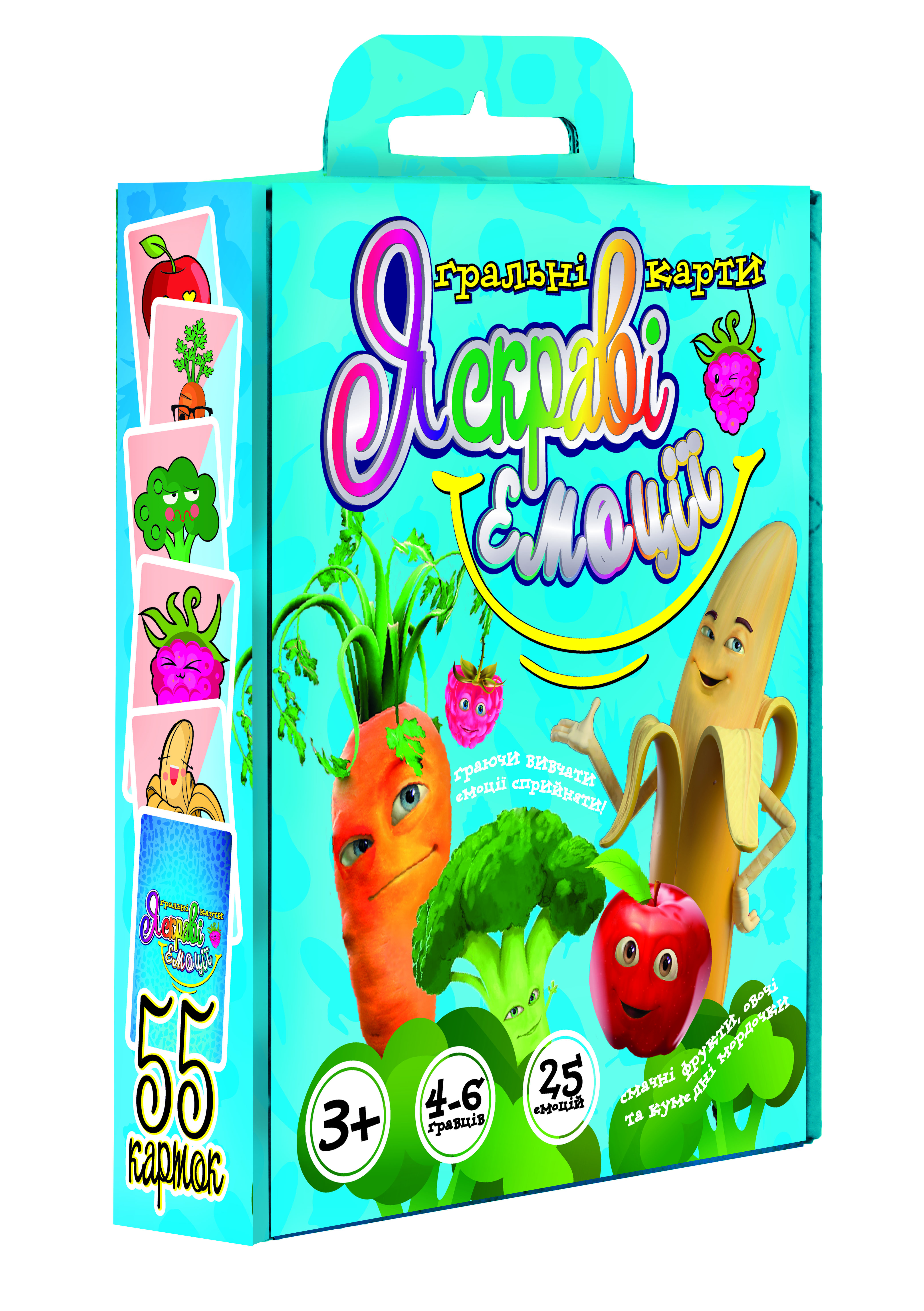 Веселое развлечение для компании – настольная игра «Яркие эмоции». Сможет заинтересовать не только детей, но и взрослых, даст возможность увлекательно провести время всей семье и при этом развить навыки общения и психологии. Поможет развить и проявить эмоции малышей, которые способствуют нравственному развитию и влияют на поведение ребенка в будущем. В наличии 55 игровых карт с изображениями различных забавных овощных персонажей и ситуаций. На карточках изображены различные эмоции персонажей. Суть игры – определить эмоцию, продемонстрированную сдающим. Ответ можно выразить словами либо действиями и показать соответствующую карточку. Побеждает тот, кто наберет максимальное количество очков. В процессе игры можно обсуждать и дополнять действия сдающего для уточнения ответа. В инструкции приведены правила игры и как определить победителя. Карты выполнены из картона.