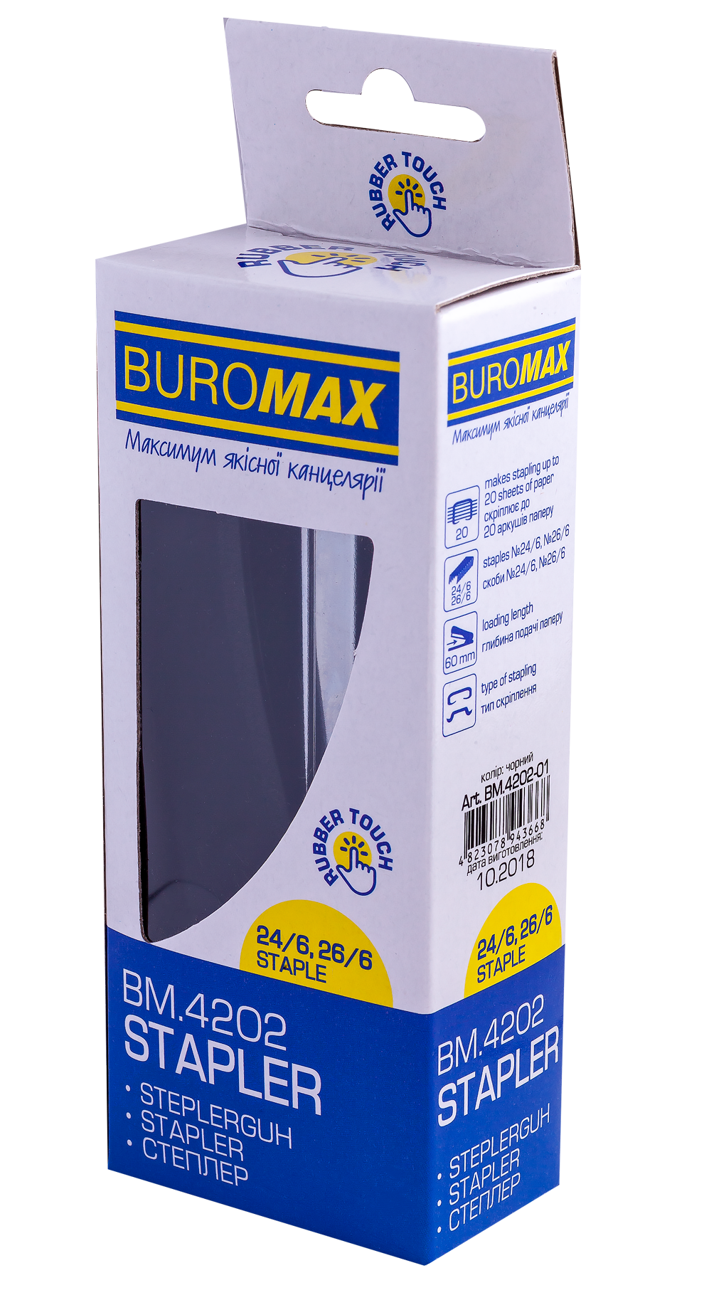 Металева підошва, пластиковий прогумований корпус Rubber touch Пластиний механізм Скоба №24/6, 26/6 Тип зшивання: закритий, відкритий Скріплює до 20 аркушів паперу 80 г/м2 Глибина закладки паперу: 60 мм Картонна упаковка з віконцем, європідвіс