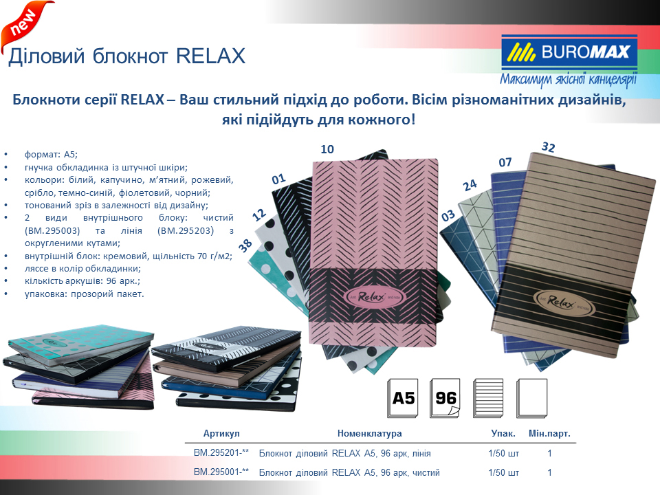 Блокноты серии RELAX - Ваш стильный подход к работе. Восемь различных дизайнов, которые подойдут для каждого! формат: А5; гибкая обложка из искусственной кожи; цвета: мятный; тонированный срез в зависимости от дизайна; линовка: линия; внутренний блок: кремовый с округленными углами, плотность 70 г / м2; ляссе в цвет обложки; количество листов: 96 л .; упаковка: прозрачный пакет.